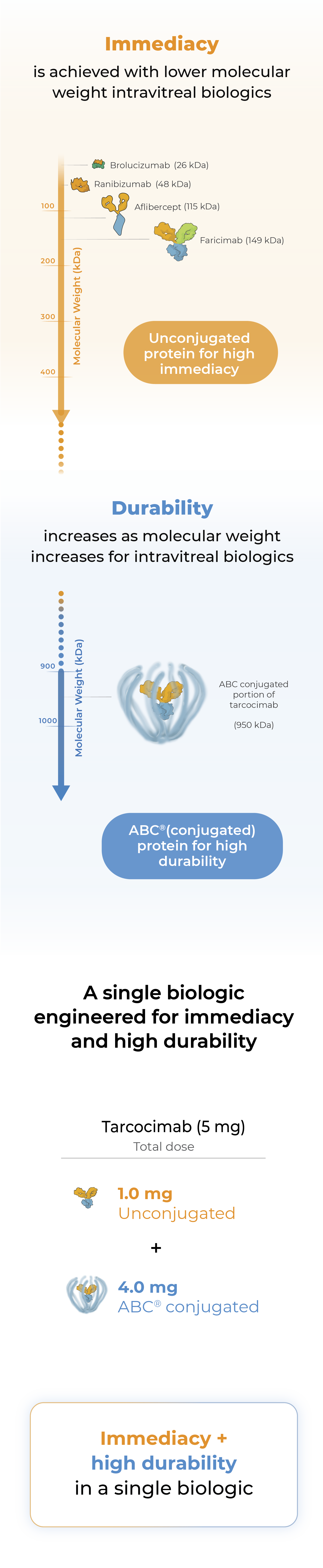 Tarcocimab combines unconjugated and ABC®(conjugated) protein in a single biologic. The unconjugated protein is designed to deliver a strong “pulse” of VEGF inhibition (immediacy) and the conjugated protein is designed to persist in the eye to provide sustained disease control.