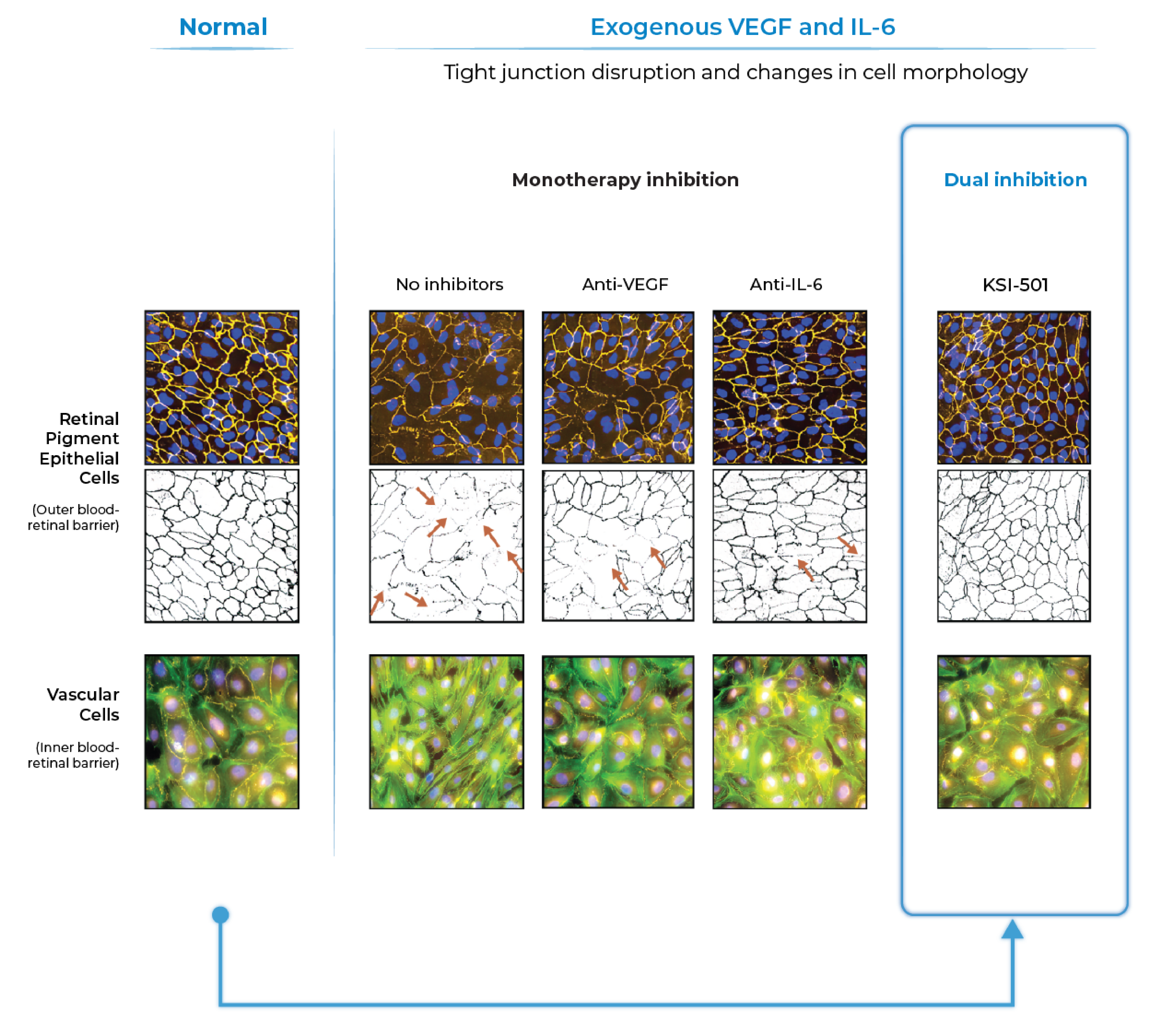 Dual inhibition of VEGF and IL-6 by KSI-501 confers superior normalization of complex tight junction-mediated barrier biology compared to either anti-VEGF or anti-IL-6 monotherapy alone demonstrating the synergistic effect of IL-6 and VEGF dual inhibition on retinal vascular disease.