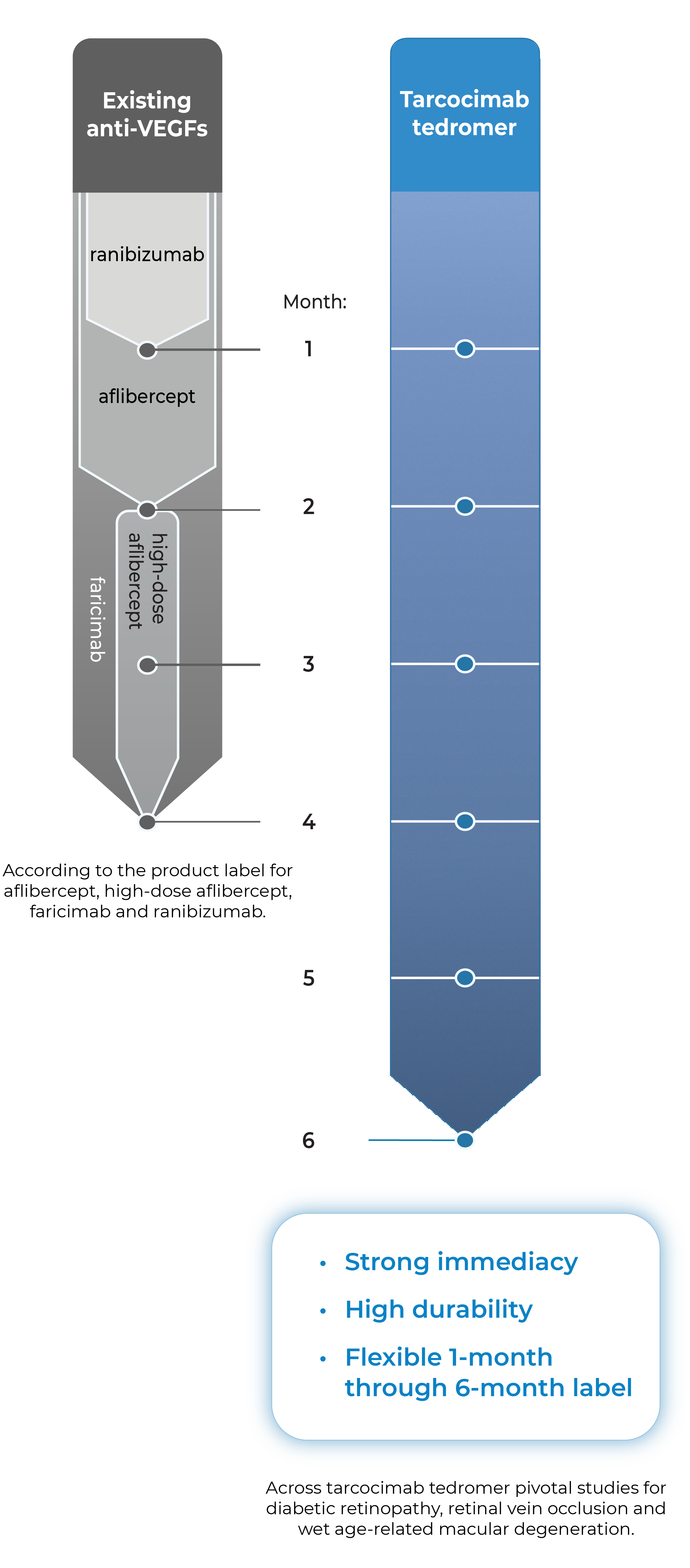 Tarcocimab is an anti-VEGF Antibody Biopolymer Conjugate (ABC®) being developed to provide strong immediacy and high durability. Across multiple studies in high-prevalence retinal vascular diseases, tarcocimab demonstrated consistent 6-month predominant durability and favorable safety. With a flexible 1-month through 6-month label, we believe tarcocimab can be the “mainstay” intravitreal biologic for all patients.