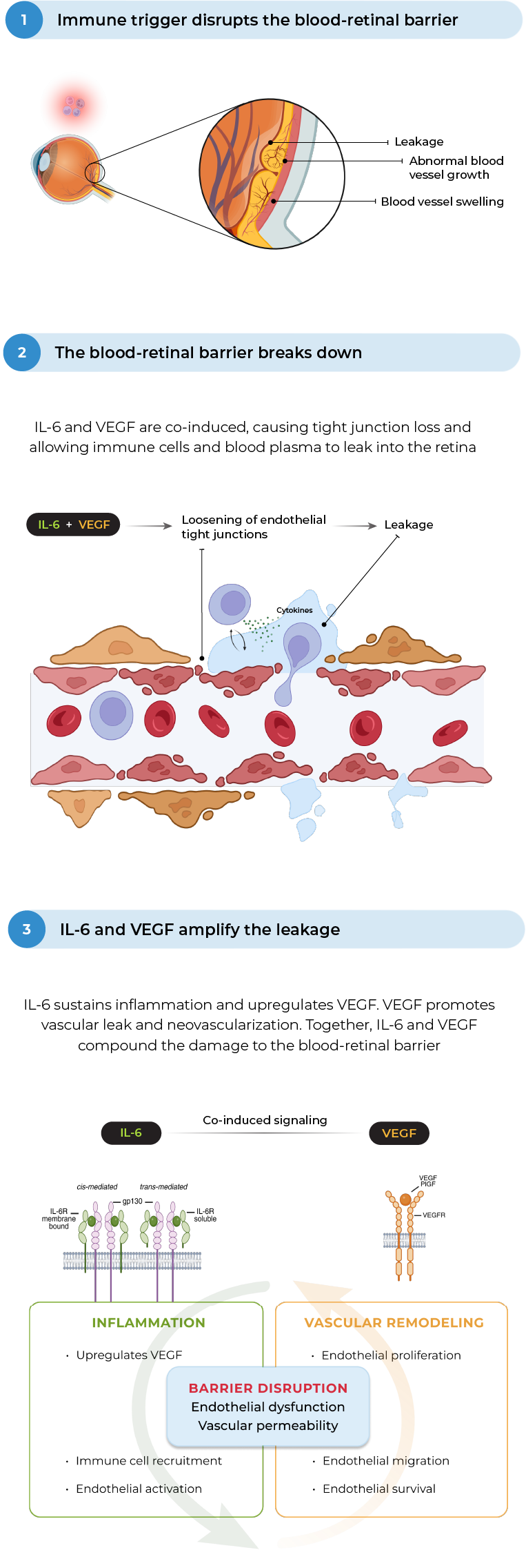 In wet AMD, there is preclinical evidence that IL-6 is implicated in the development of choroidal neovascularization and clinical evidence demonstrating that IL-6 is associated with development and progression of AMD, resistance to anti-VEGF treatment in wet AMD, and reactivation of disease by promoting growth of new neovascular membranes.